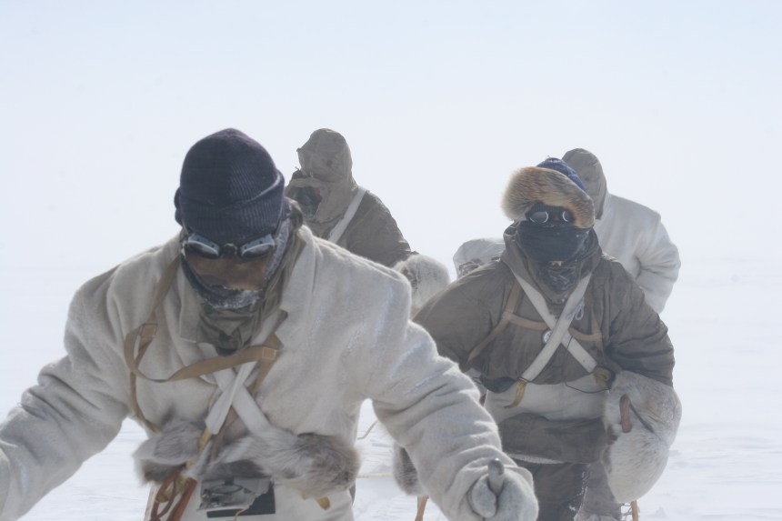 Scott team in storm3This one is more relevant perhaps.  The wind on this day in Greenland was strong enough, at one point, to blow over our sledge weighing several hundred kilos and we battled through it for just over 10 hours.  That’s me in front, Bruce Parry behind, then Chris Van Tulleken and Rory O’Connor.  I am wearing a sort of sports jacket made out of a woollen blanket, over a wind smock and over trousers of gaberdine, over an assortment of woollen jumpers and long johns. While the others are wearing their reindeer skin mitts I have opted to use mine as shock absorbers on the harness and am wearing my ancient, brilliant and much-patched dachstein felted woollen mitts.  To protect our noses from frostbite we had each cobbled together our own personal face merkin.  Mine was made from a patch of sheepskin.  Chris’s appeared to have been cut from an arctic fox’s scrotum.
