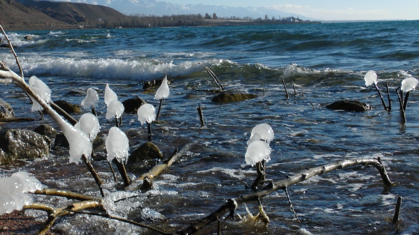 Awaiting the Consul´s ruling we have been holed up in the Issyk-Kul region of Kyrgyzstan, skiing and generally exploring.  Issyk-Kul is the world´s second largest mountain lake, after Titicaca in Peru.  It´s big, taking about 5-6hrs to drive around, extremely blue and has very big 3000-5000m mountains almost all the way around it.  The name means hot lake, which is misleading for it´s definitely not, but there is something going on because it doesn´t freeze.  A beach we camped on for a few nights froze solid almost as soon as the sun was off it and rocks and sticks splashed by waves at its edge were lumps of shining ice in the morning, but the water that stayed in the lake remained unfrozen.  It hasn´t been the perfect camping temperature.